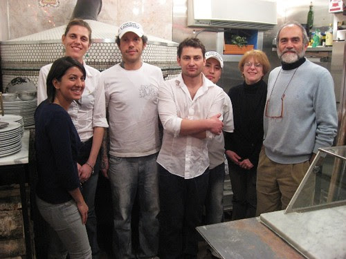 Chiariamo subito: io non sono una di quelle che pretendono di mangiare all'italiana anche in capo al mondo, anzi. Mi piace tutto e ho sempre sbandierato a destra e a manca che assaggiare la cucina del luogo è una delle tante cose per cui vale la pena di fare un viaggio. Ma come dappertutto, anche per me esiste la fatidica eccezione che conferma la regola, e si chiama Una pizza napoletana. E' una vera autentica tradizionalissima pizzeria napoletana trapiantata nel Village, e il suo proprietario, Tony Mangieri, è un fondamentalista, uno che si farebbe tagliare una mano piuttosto che mettere una fetta di salame o un pezzo di peperone su una delle sue pizze. Per lui, solo acqua sale e farina, e impasto rigorosamente fatto a mano. Niente lievito di birra e un forno a legna, savasandìììììììììr Offre un menu che credo sia il più striminzito di tutta New York: quattro soli tipi di pizze, niente insalate niente dolci, niente che possa ricordare le mastodontiche untissime e superaccessoriate pizze americane. Vino acqua e birra, ma niente bibite dolci e gasate, e alla fine solo caffè fatto con la napoletana, accompagnato da un quadretto di cioccolato di Modica. stop. Così facendo, Tony è diventato una star, fotografato intervistato e citato sui giornali più prestigiosi. Ma tutte queste belle qualità non sarebbero state sufficienti a spingermi a caldeggiare la pizza napoletana di Tony, mentre c'è un particolare che, da solo, mi è bastato per far balzare questo tatuatissimo giovanotto in cima alle mie preferenze culinarie nella Grande Mela. Anthony ha affermato pubblicamente che la mia cucina è la migliore tra le cucine casalinghe che lui abbia mai assaggiato, e per un ragazzo italo americano che rimpiange i manicaretti della nonna bisogna riconoscere che questo è un complimento davvero grosso. Perciò, se per una sera vi punge la nostalgia di una buona pizza fatta come a Napoli, sapete dove andare. Dimenticavo: se ci capitate di giovedi sera, potreste essere serviti al tavolo dalla figlia emigrante